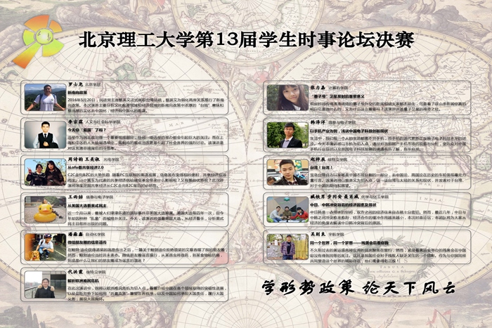 學生時事論壇活動是北京理工大學在形勢與政策教育方面開展的一項特色工作,通過比賽的形式鼓勵學生思考時事問題,以學生的視角透視時政熱點,感觸時代脈搏,培養當代大學生責任感和使命感。學生時事論壇活動由我校原理學院率先開展,并得到學生的積極響應。我校黨委學生工作部及時總結基層經驗,自2007年(第四屆學生時事論壇)起,每年舉辦北京理工大學學生時事論壇,今年迎來了第十三屆學生時事論壇的比賽。