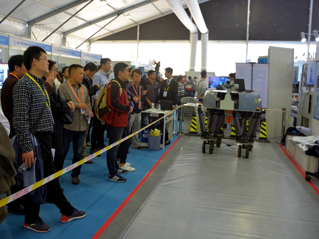 本次參加全國“挑戰杯”的“北理哪吒”,采用輪式滑行最大速度可達每小時30公里,輪距可在0.5米到1米之間調整,機身高度可在1.2米到1.5米之間調整,最大爬坡角度為25°。機器人四個輪子可獨立驅動,順、逆時針原地可旋轉;在遇到障礙物時,可自動調整輪距和底盤高度實現越障。同時,也可通過環境感知系統探測路徑,自動實現直線、90度轉彎、以及S型彎道等循跡運動。