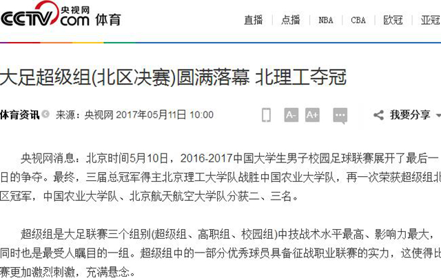 北京時間5月10日,2016-2017中國大學生男子校園足球聯賽展開了最后一日的爭奪。最終,三屆總冠軍得主北京理工大學隊戰勝中國農業大學隊,再一次榮獲超級組北區冠軍,中國農業大學隊、北京航天航空大學隊分獲二、三名。