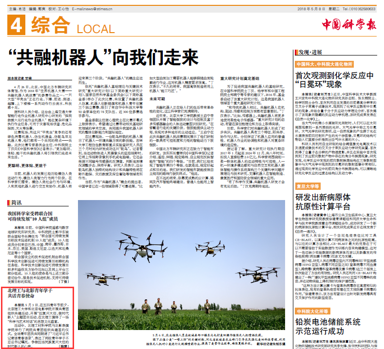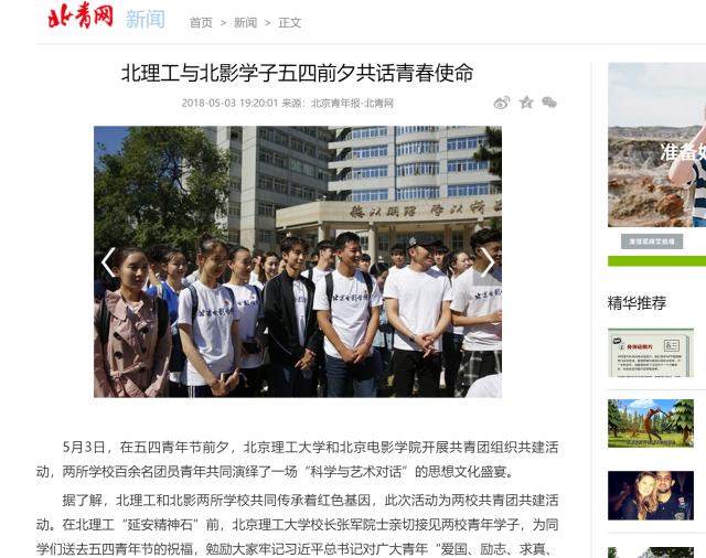 編輯:辛嘉洋 審核:王征 閱讀次數:【編者按】5月3日,在五四青年節前夕,北京理工大學和北京電影學院開展共青團組織共建活動,兩所學校百余名團員青年共同學習習近平總書記在北京大學師生座談會上的講話精神,開展“擔復興大任 做時代新人”主題團日活動,在美麗的北理工校園演繹了一場“科學與藝術對話”的思想文化盛宴。這是繼今年3月北理工校長張軍院士引用北影學生王俊凱演唱的《明日歌》勉勵畢業生,在引發校內外關注后,北理工抓住契機策劃開展的延伸教育活動。在本次活動中,兩校青年學生代表共同學習宣傳習近平新時代中國特色社會主義思想和黨的十九大精神,牢記5月2日習近平總書記在北京大學考察時對新時代廣大青年成長發展的期望與要求,共話青春夢想,充分展現了新時代優秀團員青年勇擔民族復興大任,努力成長為社會主義建設者和接班人,不辱時代使命,不負人民期望,爭做時代新人的青春風采,再次引發各界廣泛關注,《北京日報》《光明日報》《中國科學報》《中國青年報》《中國日報》《北京青年報》、團中央新聞中心、光明網、騰訊網、新浪網等各大媒體第一時間進行了報道。