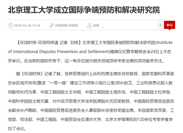 【環球網】北京理工大學成立國際爭端預防和解決研究院