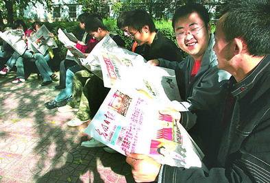 10月18日,北京理工大學宇航科學技術學院05級本科黨支部的大學生從光明日報上學習和討論十七大報告。