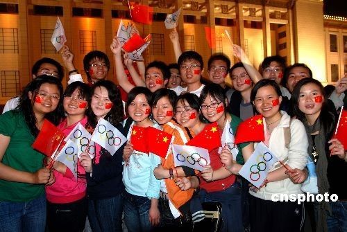 4月30日,國家博物館西門的北京奧運會倒記時牌前人山人海,許多人以在這里拍照留念的方式表達他們喜迎奧運會倒記時100天的心情。一群來自北京理工大學的學生因為臉上都貼有中國國旗而格外引人注目。 (本文來源:中新網 作者:李京生)