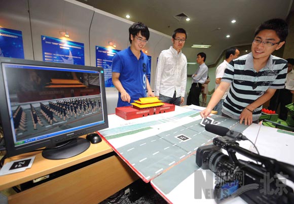 6月22日,北京理工大學軟件學院大三學生邵帥(右一)等同學在演示他們參與的獲特等獎作品——基于現實的廣場慶典互動式創意設計系統。當日,歷時三個多月的第五屆“挑戰杯”首都大學生課外學術科技作品競賽落幕,此次競賽吸引了首都54所高校3000余名同學參加,上報作品547件。據悉,此次競賽結束后,組委會將從獲獎作品中選拔84件作品,參加下半年舉行第十一屆全國“挑戰杯”競賽。新華社記者羅曉光攝