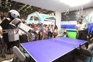 在展示現場,兩個手持乒乓球拍的“匯童”5代仿人機器人分立乒乓球桌兩端,在一端的機器人發球后不到0.3秒,另一端的機器人就作出了擊球反應,兩方對打十數回合。不僅如此,“匯童”5代仿人機器人對人機對打也應付自如,儼然成為機器人的“國球手”。