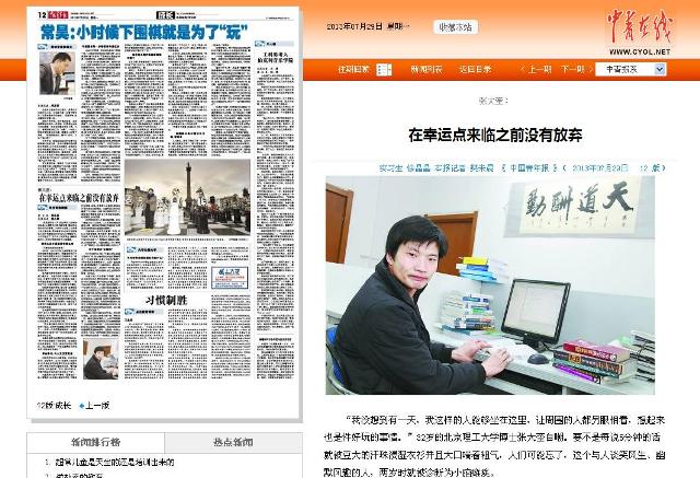 (實習生 徐晶晶 本報記者 樊未晨)“我沒想到有一天,我這樣的人能夠坐在這里,讓周圍的人都另眼相看,想起來也是件好玩的事情。”32歲的北京理工大學博士張大奎自嘲。要不是每說5分鐘的話就被豆大的汗珠浸濕衣衫并且大口喘著粗氣,人們可能忘了,這個與人談笑風生、幽默風趣的人,兩歲時就被診斷為小腦癱瘓。