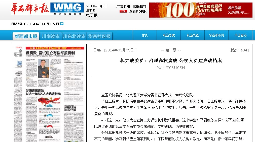 【華西都市報(bào)】北理工黨委書(shū)記郭大成:治理高校腐敗 公權(quán)人員建廉政檔案