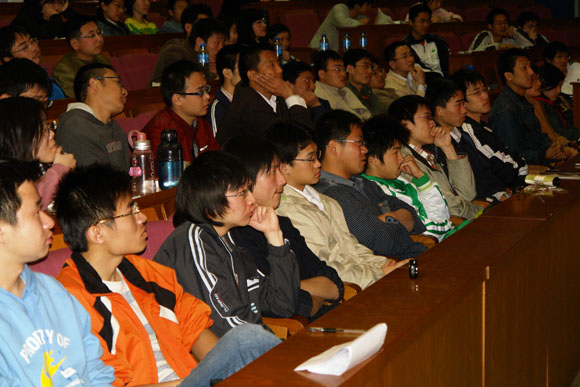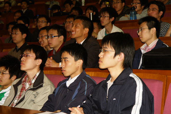 他講到了中國足球,分析了目前中超的形勢和幾支主要的球隊,講到了中國女足的形勢,以及中國男足亞洲杯的陣容,講到了在英超踢球的中國球員,如董方卓、鄭智、孫繼海等,又講到了歐洲的足球聯(lián)賽,主要描述了曼聯(lián)和切爾西這兩支球隊的一些情況。他特別肯定了北京理工大學足球隊取得的成績。大家露出了會心的微笑。