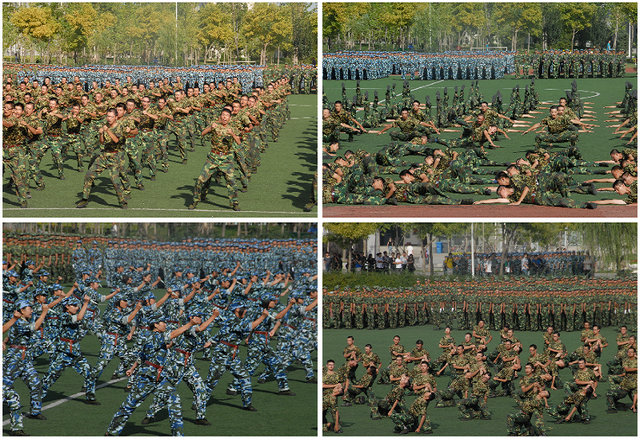 軍事科目表演中,由軍訓旅六個營組成的七個表演方陣,分別進行了捕俘刀、一招制敵、綜合格斗術和刺殺操等科目的表演。各表演方陣動作標準,氣勢如虹。
