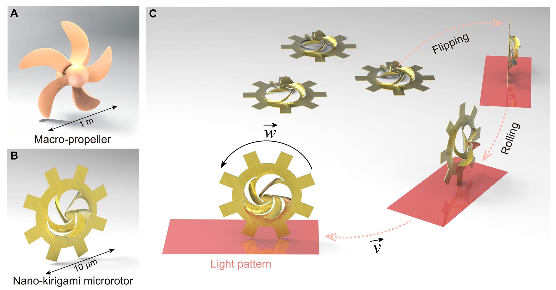 圖1:納米剪紙微型轉子的設計及自由操控。(A)宏觀螺旋槳結構示意圖;(B)納米剪紙微型轉子示意圖,大小約為標準宏觀螺旋槳的十萬分之一;(C)利用光電鑷中可編程光圖案實現納米剪紙微型轉子自由操控的示意圖。