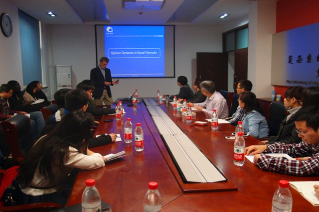 Roberto Tempo教授分別從Opinion dynamics in social networks和Sensor localization of wireless networks兩個角度深入淺出的介紹了分布式隨機算法和時間平均算法的最新研究成果,詳細闡述了隨機算法的內涵和性質及其在社會網絡系統分析與控制中的應用。會后,Roberto Tempo教授與本校師生進行了熱烈的交流與討論。