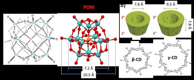 該文報(bào)道的研究工作是將多金屬氧簇(縮寫為POMs,如圖1(a)表示的一種雜多酸,十二鉬酸磷)和環(huán)糊精(一類綠色的有機(jī)化合物,Cyclodextrins,縮寫為CDs, 如圖1(b) 表示的兩種最常見的β-和γ-環(huán)糊精)運(yùn)用分子間作用力有效地結(jié)合起來。這兩大類物質(zhì)自人類發(fā)現(xiàn)至今已經(jīng)有了100多年的歷史,有關(guān)它們各自的研究也取得了豐碩的成果,但將兩類物質(zhì)組裝成為雜化材料卻一直未能實(shí)現(xiàn)。主要問題在于環(huán)糊精的內(nèi)腔是疏水性的,而多金屬氧簇的表面是親水性的。另外,環(huán)糊精這類物質(zhì)難于結(jié)晶也是阻礙有關(guān)它的研究與發(fā)展的一個(gè)瓶頸。