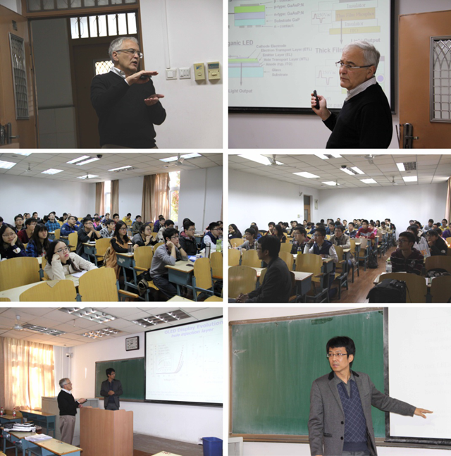 在訪問期間,葛內(nèi)德副校長及隨行助手賈會(huì)平研究員在3號(hào)樓302教室為光電學(xué)院光電信息工程專業(yè)本科四年級(jí)同學(xué)講授了《光電顯示技術(shù)》課程中的《OLED顯示技術(shù)》部分。學(xué)生們認(rèn)為葛內(nèi)德教授上課充滿激情,詼諧生動(dòng),講課內(nèi)容豐富,當(dāng)學(xué)生們了解到OLED顯示技術(shù)發(fā)展奠基人鄧青云博士為華人時(shí),學(xué)生產(chǎn)生了極大的自豪感。賈會(huì)平研究員和唐義副教授對(duì)課件的關(guān)鍵詞語進(jìn)行了中文對(duì)照,并就課程中的部分難點(diǎn)和重點(diǎn)問題進(jìn)行翻譯和解釋。