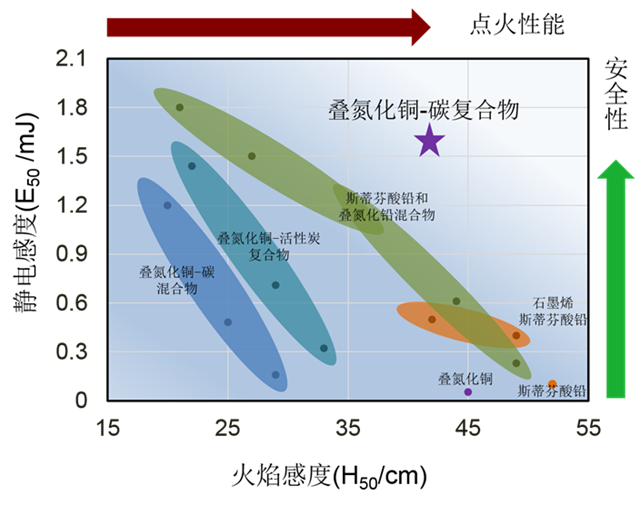 該碳-疊氮化銅復合材料具有鈍感的靜電火花感度,50%靜電發火能量為1.6 mJ,明顯高于疊氮化銅(0.2 mJ)和斯蒂芬酸鉛(0.5 mJ)等常規的高能量起爆藥,具有合成方法簡單、安全穩定等顯著優勢。同時,通過該方法得到的碳-疊氮化銅復合材料10 mg就可以獨立完成點火起爆黑索金,具有更小的極限藥量,在航天航空、武器系統以及民用爆破器材等領域中具有極大的應用價值。