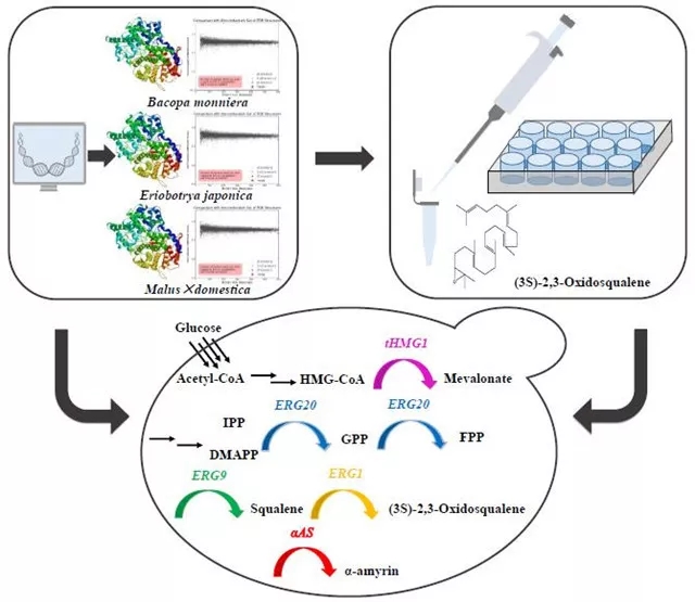 萜類化合物是植物次級代謝產物中最大的一個家族,廣泛分布于自然界中,α-香樹脂醇是植物當中重要的五環三萜,具有重要的生理和藥理活性。α-香樹脂醇是由(3S)-2,3-氧化鯊烯在氧化鯊烯環化酶蛋白家族α-香樹脂醇合酶(α-AS)的催化下形成的。由于α-香樹脂醇在植物中的含量極低,分離純化步驟繁雜,目前尚未商業化開發生產。利用整合了高效α-AS的工程化釀酒酵母,可用作α-香樹脂醇的可持續生產方案。