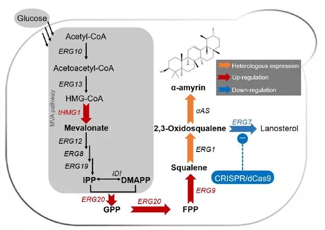 在本研究中,研究人員通過將α-香樹脂醇合酶MdOSC1引入釀酒酵母中,同時增加(3S)-2,3-氧化角鯊烯的供應以實現高效生產α-香樹脂醇,搖瓶產量達到11.97±0.61mg / L,是之前報道的最高產量的5.8倍。