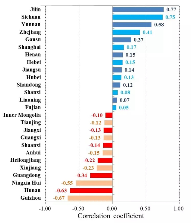 基于測算出的煤電機組燃料消耗率,本研究分析了2014年中國裝機容量超過1GW的所有煤電廠的機組發電效率與其年度運行小時數之間的相關性,發現有接近一半的省份的煤電機組處于低效運行的狀態,即機組的發電效率越高,年度運行時間反而越少。由此,佐證了中國電力系統運行的低效率和實施經濟調度機制的必要性。