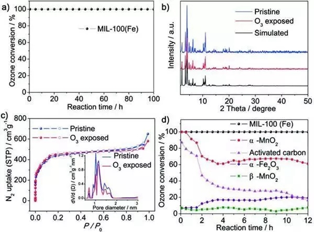MIL-100(Fe)物理性能表征及對臭氧轉化率(a)MIL-100(Fe)的臭氧轉化率。b)模擬的、合成的和暴露于臭氧的MIL-100(Fe)的粉末XRD圖案。c)在暴露于臭氧之前和之后,MIL-100(Fe)的N2吸附等溫線。插圖:MIL-100(Fe)的孔徑分布。d)分別對MIL-100(Fe)、α-MnO2、活性炭、α-Fe2O3和β-MnO2進行臭氧轉化。條件:用0.27g石英砂稀釋的0.03g催化劑,C(O?)="45ppm,流速=1000mL·min^-1,RH=45%,室溫。)