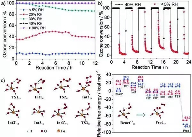 MIL-100(Fe)不同高濕度環境下對臭氧的轉化率(a)分別在<5%RH、20%RH、30%RH、40%RH和> 90%RH下MIL-100(Fe)的臭氧轉化率。b)在交替相對濕度下MIL-100(Fe)上的臭氧轉化率。c)優化了在MIL‐100(Fe)催化臭氧分解過程中沿路徑穩定點的結構和相應的勢能曲線。d)藍色和紅線分別表示六重態和四重態MIL-100(Fe)氫氧化物復合物的能級。實驗條件:用0.27g石英砂稀釋0.03g催化劑,C(O?)= 45ppm,流速="1000mL·min^-1,RH="45%,室溫。)