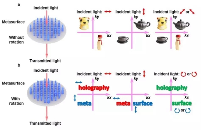 伴隨著微納加工工藝的進步,超穎表面在全息領域展現出了獨特的應用前景。相比于基于空間光調制器的傳統全息方法,基于超穎表面產生的全息再現像的分辨率和再現質量得到了極大地提高,可以克服傳統全息所面臨的諸如帶寬窄、視場角小、存在多級衍射級次串擾、孿生像等挑戰。同時,基于超穎表面的全息方法能夠克服自然界材料(如空間光調制器、光刻膠)對偏振不敏感,僅能實現標量全息的限制。