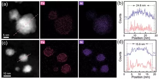 (a,b)循環前和(c,d)循環后Ni?FeN-G的HAADF-STEM圖像和相應的元素分布