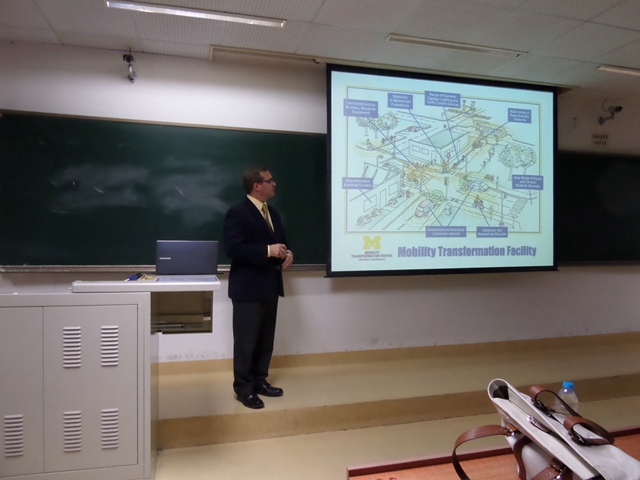 10月23日,應機械與車輛學院交通工程系的邀請,美國密歇根大學交通運輸研究所的James R.Sayer與交通工程系教師、研究生進行了學術交流,并面向全校師生作了題為“Connected and Automated Vehicles: Moving Toward Deployment”的學術報告。