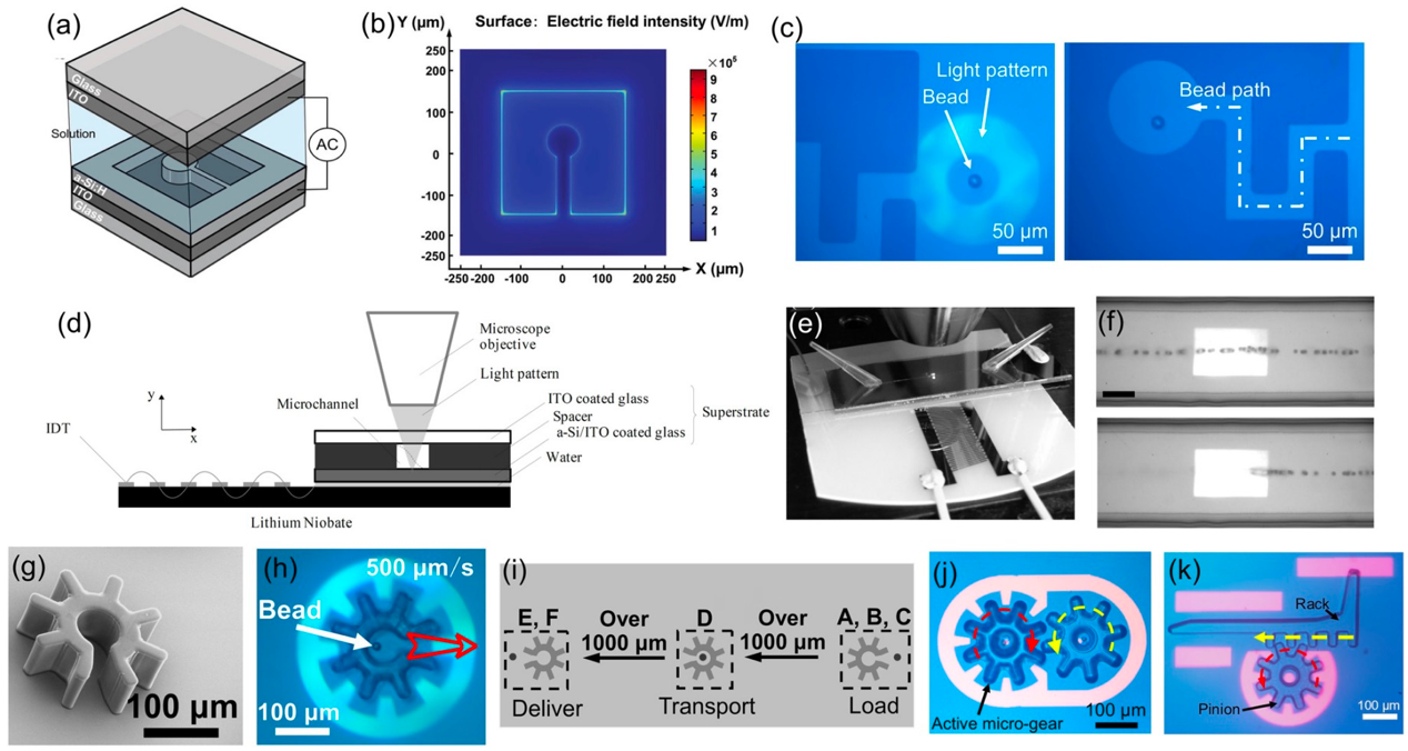 光電鑷技術還可以與其他微流控技術結合使用,例如流道式微流控、數字微流控和光電潤濕技術等。將光電鑷技術與微流控技術集成在一個系統后,即可控制微流控裝置不斷地將樣品輸送到光電鑷工作的區域(圖6),實現基于光電鑷技術的高通量目標分選、分離和處理。同時,光電鑷技術也常與其他微操作技術集成使用,例如傳統介電泳技術、聲學鑷子、微納米機器人等(圖7),這種集成提升了光電鑷技術對微小目標的操控靈活度,拓展了光電鑷技術的應用領域。