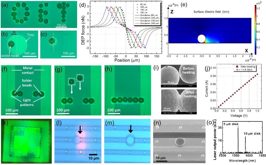 光電鑷系統常用于微米以及納米尺度物體的操作和組裝。該技術已被用于各種納米材料,包括且不限于半導體和金屬納米線、碳納米管、石墨烯納米片、導電納米顆粒以及金屬離子。圖3所示即為使用光電鑷系統操縱和裝配各種納米尺度的物體。同時,光電鑷還被用于操控數微米到幾百微米量級的各種微尺度物體,包括介電/金屬微粒、油/水滴、氣泡等。通過光電鑷組裝微型電子和光子元器件也是光電鑷技術的一個重要應用。圖4中展示了應用光電鑷技術組裝金屬球及半導體激光器的多種應用,實驗結果顯示光電鑷組裝技術對這些器件的工作性能沒有影響。