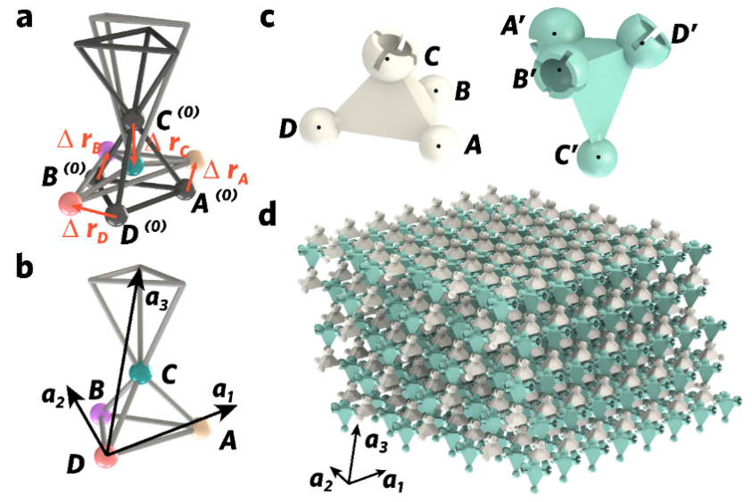 北京理工大學團隊提出了力學轉移矩陣方法(mechanical transfer matrix),通過分別研究各個力學軟模在空間上的傳遞行為,建立了各個力學軟模與結構的幾何參數之間直接的聯系,使得通過調整參數令所有力學軟模局域于結構某一特定表面成為可能。基于這一理論創新,該團隊設計并3D打印了一個拓撲完全極化的廣義焦綠石晶格(generalized pyrochlore lattice)。該團隊創新性地采用了可自由轉動的球形鉸鏈(如圖1c所示) 來消除晶格連接處的彎曲剛度,以此保證3D打印出的廣義焦綠石晶格是一個理想的等靜定結構。廣義焦綠石晶格的原胞由兩個3D打印的四面體組成,四面體的每個頂點都有一個球形鉸鏈。在圖1(d)中,白色四面體的A、B、C、D頂點與綠色四面體的A′、B′、C′、D′頂點相連,使得相鄰四面體之間可以自由旋轉。