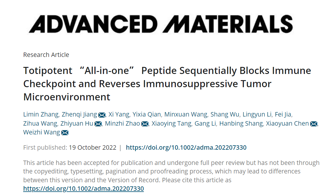 基于上述問題,北京理工大學王蔚芝課題組近日與新加坡國立大學陳小元課題組合作,開發了基于微流控芯片的靶向多肽分子多維度進化新方法。該方法可同時針對多個腫瘤相關靶標分子篩選兼具高親和力、高特異性和高度穩定組裝性能的靶向多肽,在腫瘤診療中顯示出極大的優勢。此外,該方法由于在腫瘤組織原位環境下進行分子定向進化,所獲得的分子在復雜的活體環境中更具穩定性。成果以“Totipotent ‘All-in-one’ Peptide Sequentially Blocks Immune Checkpoint and Reverses Immunosuppressive Tumor Microenvironment”為題發表在國際頂級期刊《Advanced Materials》(IF: 32.086)上。北京理工大學為第一通訊單位,化學與化工學院博士研究生張黎民為論文第一作者,北京理工大學王蔚芝研究員為最后通訊作者。新加坡國立大學陳小元教授,國家納米科學中心胡志遠研究員,趙敏芝研究員以及北京理工大學的蔣振奇博士為共同通訊作者。