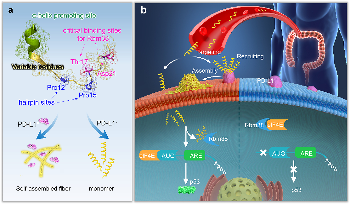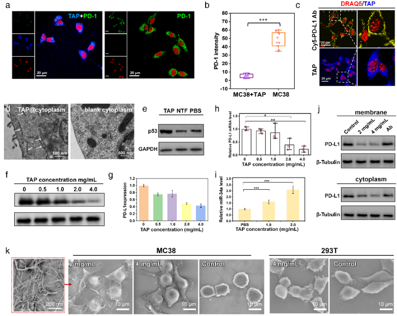進一步地,對TAP的生物學性能進行了研究,在分子及細胞水平上證明了TAP不僅能阻斷Rbm38-eIF4E復合物的形成上調p53表達,也能阻斷PD-1/PD-L1相互作用。值得注意的是,TAP具有全面下調細胞內外PD-L1含量的能力,這進一步增加了其活體診療效果。同時,由于TAP的組裝性能使其在PD-L1的招募下快速形成穩定的納米纖維進一步促進了其對相關通路的穩定持續調控??偠灾?,TAP在細胞膜上自組裝阻斷PD-L1,同時下調整個細胞中PD-L1的表達,這與其激活p53的能力相結合,使TAP成為一種潛在的強大的抗腫瘤先導分子。