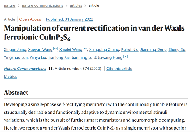 近日,北理工宇航學院王學云、洪家旺教授團隊報道了在范德瓦爾斯鐵電體Cu...