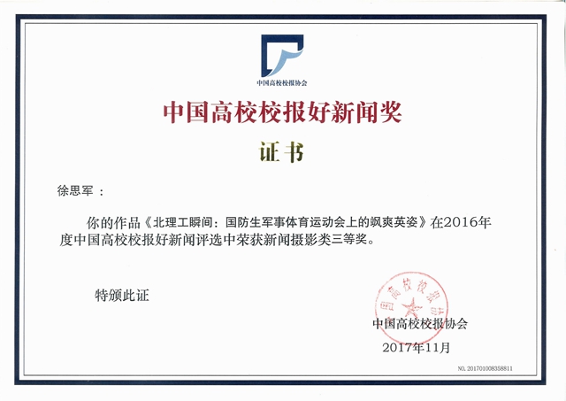 編輯:馬瑤 審核:王征 閱讀次數:11月26至28日,中國高校校報協會2017年年會暨第二屆中國高校傳媒發展高端論壇在成都舉辦,本屆論壇以“新時代中國高校傳媒的創新與堅守”為主題。論壇上揭曉了2016年度“中國高校校報好新聞”評選結果,我校校報榮獲佳績。其中,《做中國自己的炸藥,做世界最棒的炸藥——孕育出“CL-20”的北理工火炸藥學科》榮獲通訊類一等獎,《我與祖國航天事業共成長》榮獲版面類二等獎,《北理工瞬間:國防生軍事體育運動會上的颯爽英姿》榮獲新聞攝影類三等獎。