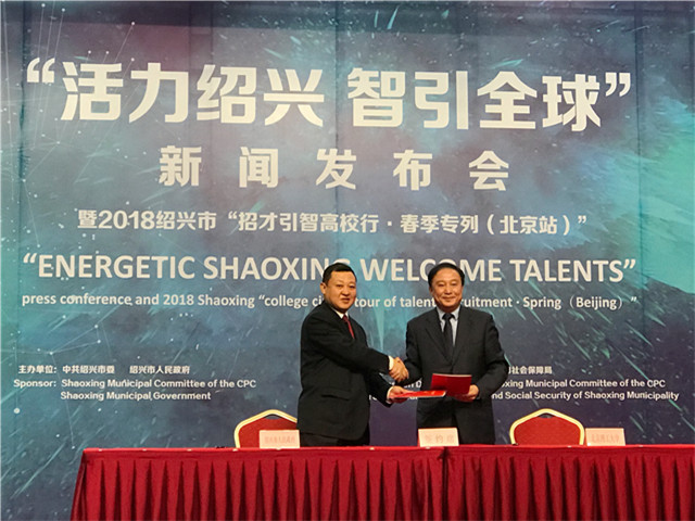 3月24日下午,“活力紹興 智引全球”新聞發布會暨2018紹興市“招才引智高校行?春季專列(北京站)”活動在友誼賓館舉行。會上,王曉鋒代表學校同紹興市簽訂了“人才智力校地合作”協議書。