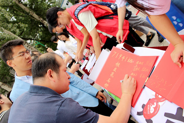 幾十年的歲月無(wú)法抹去曾經(jīng)的點(diǎn)滴回憶,也無(wú)法消磨學(xué)生時(shí)代的同窗情誼,幾十年后,校友重新相聚于母校,回憶往年入校種種,品味分別幾十年來(lái)的人生歷程,共同享受重聚的歡愉與喜悅。上午8時(shí)許,校友們便漸漸來(lái)到了我校體育館北廣場(chǎng)材料學(xué)院簽到處,在這里,他們?cè)诨鸺t的簽名冊(cè)上虔誠(chéng)地簽下了自己的名字,完成了畢業(yè)幾十年來(lái)的又一本簽到花名冊(cè),也收到了來(lái)自學(xué)院及學(xué)校準(zhǔn)備的紀(jì)念品。火紅的花名冊(cè)是他們的赤誠(chéng)之心,而在上面一一書(shū)寫(xiě)的名字則無(wú)疑是此次校友重聚的見(jiàn)證與下一個(gè)十年之約的承諾書(shū)。