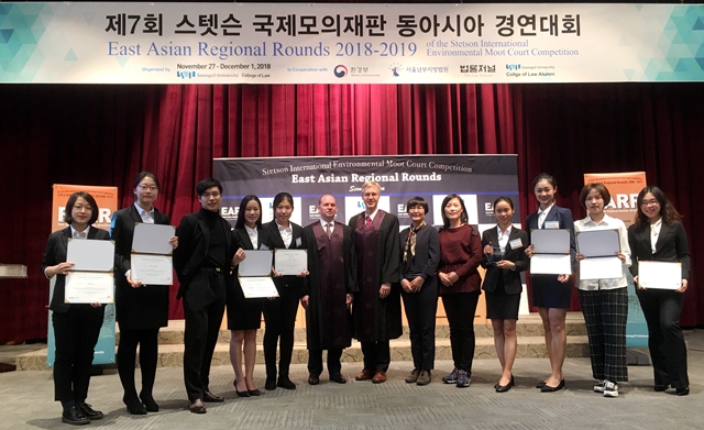 國際環境法模擬法庭大賽創始于1996年,由美國史丹森大學法學院(Stetson University College of Law)主辦,是國際環境法領域極具廣泛國際影響力的模擬法庭比賽。該比賽全程使用英文,分為地區選拔賽和國際決賽兩個階段。地區選拔賽分為北美太平洋賽區、北美大西洋賽區、拉丁美洲賽區、東亞賽區等8個賽區。東亞賽區選拔賽由韓國崇實大學承辦。