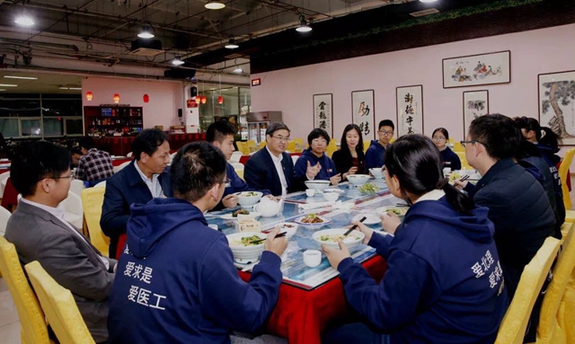 晚飯時間,張軍邀請求是書院醫工融合實驗班的同學們在南區食堂共進晚餐。2018年,學校圍繞醫工融合、生物醫學工程領域的國際發展前沿和國家重大需求,為培養具有學科領軍、領導能力的醫工融合一流創新拔尖人才,首次開設醫工融合實驗班。餐敘中,張軍不僅分享了自己對大學生活的理解,更為大家展望了醫工融合的廣闊發展前景,鼓勵同學們努力學習,成為醫工融合專業的優秀學生。“與校長共進晚餐,感覺就是圍坐在一桌的溫馨‘家人’。在聽了張校長介紹的醫工融合發展前景后,我對專業更加充滿期待,也更加堅定自己所選擇的發展之路?!贬t工融合實驗班的康安順同學分享了自己的感受。