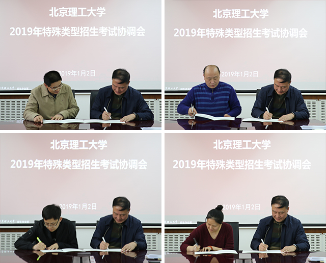 會上,王曉鋒代表學校分別與外國語學院、體育部、校團委、人文與社會科學學院負責人簽訂了《北京理工大學2019年特殊類型招生考試工作責任書》。