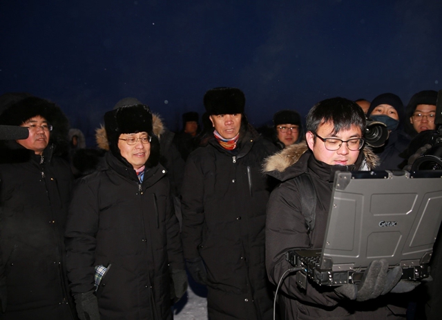孫逢春院士(左三)與王朝陽教授(左二)在極寒環境試驗現場
