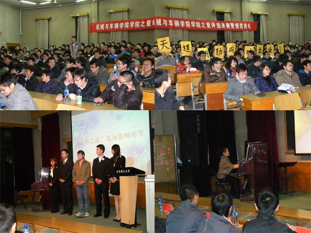 2009年12月20日晚7點,機械與車輛學院分團委在7號樓108舉辦了機械與車輛學院第六屆“學院之星”評選決賽暨頒獎典禮活動。學院分團委的老師和四名學生代表一起擔任評委。“學習之星”、“工作之星”、“體育之星”、“文藝之星”,十五位同學同臺競技,一展當代北京理工大學大學生風采,為同學們奉獻了一道精神盛宴。