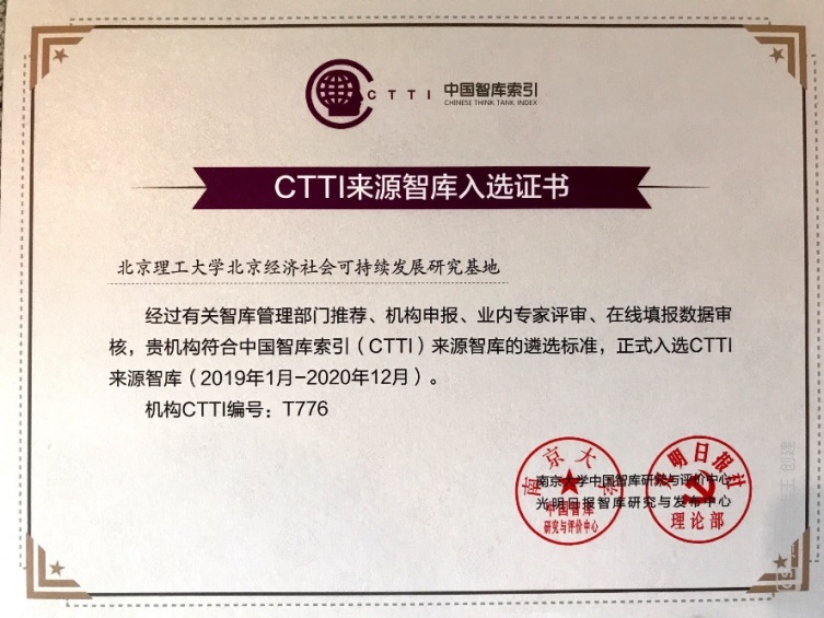 北京經濟社會可持續發展研究基地入選CTTI來源智庫