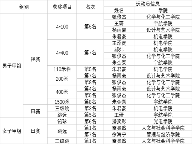 在體育部精心組織與趙俊華、朱峰教練帶領下,通過兩天賽場激烈角逐,首次參賽的我校普通學生田徑運動代表隊最終取得男子團體、女子團體和男女團體總分三項第八名優異成績,并榮獲大賽最佳組織獎。其中,人文與社會科學學院雷昊然同學獨攬大賽女子跳遠和三級跳兩枚金牌,機電學院朱君豪同學勇奪甲組三級跳銅牌,實現了我校普通學生運動隊新的突破。