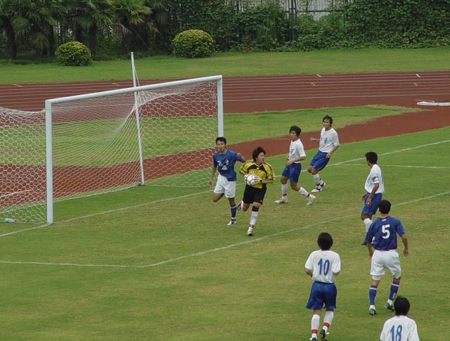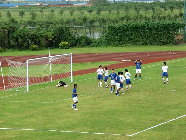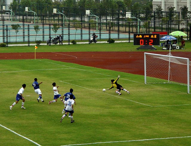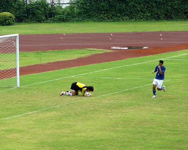 對方守門員面對連續不斷的進攻,顯得有點手忙腳亂。