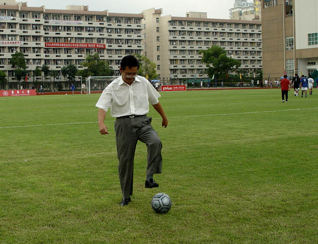 比賽開始后,面對以職業球員為主組成的上海足球隊,我校足球隊敢打敢拼。