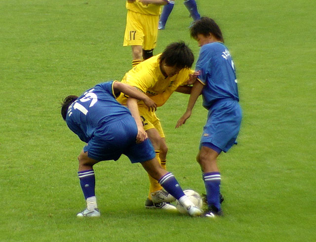 在從陣勢上反客為主的我校“啦啦隊(duì)”的聲聲助威中,身著藍(lán)色球衣的我校足球隊(duì)明顯加強(qiáng)進(jìn)攻,基本控制了中場。