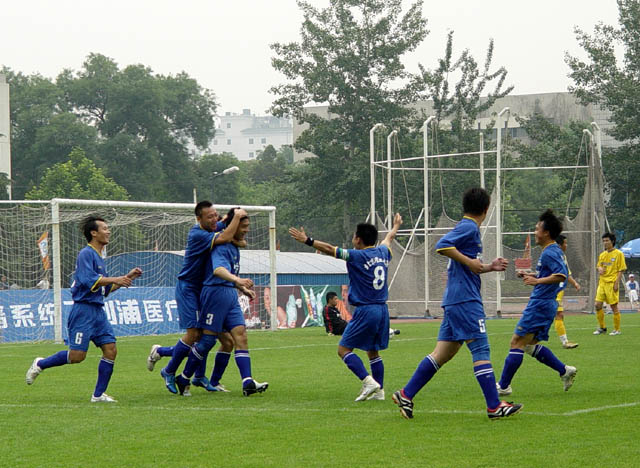 北理控制了大半場比賽,卻被人大率先打進(jìn)一球,這多少激起了隊(duì)員們的斗志。全場比賽進(jìn)行到第75分鐘時(shí),北理7號(hào)李爽帶球殺入禁區(qū),在三名對方防守隊(duì)員的圍堵之下起腳怒射,皮球飛入死角,1;1平。北理的攻勢并未就此打住,進(jìn)球之后不久,北理隊(duì)員傳中,人大球員搶得第一點(diǎn)后沒有將球控制住,禁區(qū)內(nèi)一片混亂,北理3號(hào)姚遠(yuǎn)在亂軍之中搶得第二點(diǎn)打入制勝一球。此后人大試圖進(jìn)行反擊,但幾次進(jìn)攻均沒有成功。而北理也沒有得到擴(kuò)大比分的機(jī)會(huì)。92分種,裁判三聲哨響,全場比賽結(jié)束。北理2:1取得首戰(zhàn)的勝利。