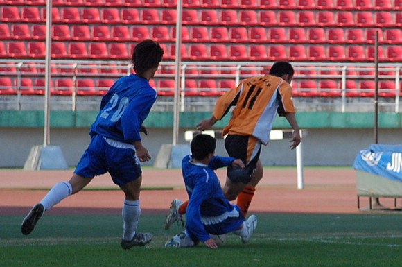 北京理工大學(xué)足球隊(duì)11號隊(duì)員王強(qiáng)帶球沉底突破進(jìn)入禁區(qū)前被對方鏟倒。