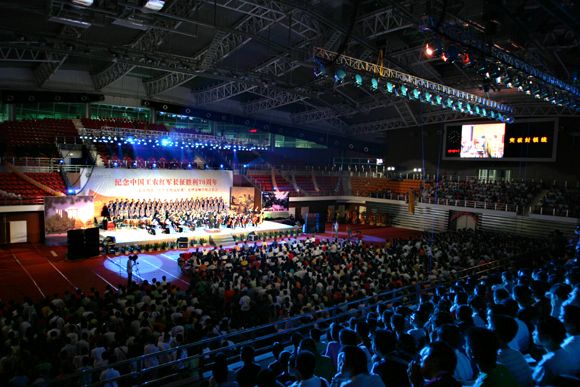 作為我校2006年藝術節的重頭戲,9月21日晚上,長征組歌大型交響合唱音樂會在體育文化綜合館隆重舉行。在長征勝利70周年之際,以長征為主題的音樂會,不僅讓觀眾得到藝術上的享受,更帶領觀眾重溫和回顧了那個硝煙彌漫、充滿著理想與激情的革命年代,弘揚了愛國、愛黨的情懷。