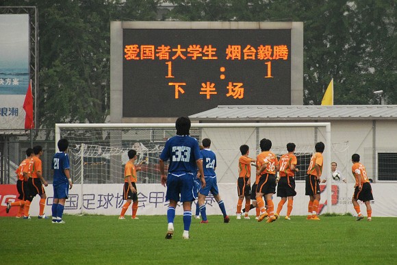 第19分鐘,煙臺毅騰再次獲得機會。煙臺隊中路配合直傳北京理工隊身后,皮球被張淼一蹭但是沒有將球處理干凈。7號咸濤在禁區內拿球直接轉身盤過張淼傳中,禁區內北理工隊門將孫程將球打出,大禁區外后插上的煙臺隊隊員起腳打門,皮球擦著立柱滑出底線。