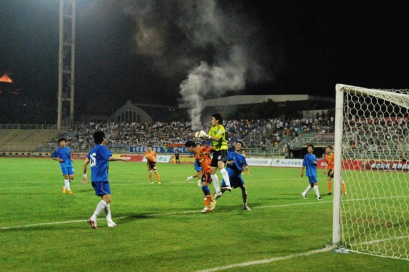 第18分鐘北京理工在禁區(qū)弧附近犯規(guī),九方隊(duì)獲得一個(gè)位置很好的任意球,霍頓主罰打飛.